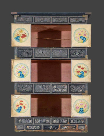 정면 전체와 양쪽 측면은 전통 회화와 공예가 결합된 산수문과 산수인물문을 위주로 문자, 꽃, 과실, 귀갑문(거북의 등껍질 모양처럼 겹친 육각형으로 연결된 무늬) 등 다양한 나전 무늬로 장식돼 있다. 정면에 설치된 6개의 문짝 안쪽은 밝고 화려한 색채의 괴석화훼도(괴상한 모양의 돌(괴석)과 화초가 그려진 그림 )로 장식한 점도 중요한 특징이다.