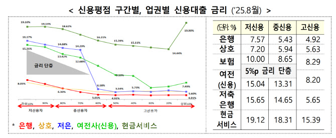 금융위에 따르면 신용평점 상위 60% 구간까지는 은행권 신용대출 금리가 6%대에 형성돼 있지만, 그 아래 구간부터는 저축은행·여신전문금융사 등을 중심으로 금리가 14% 수준까지 급등한다. 송병관 금융위 서민금융과장은 “저축은행과 여전사의 경우 중신용자 구간부터 금리가 튀기 시작한다”며 “이 금리 단층을 해소하는 데 정책의 초점을 맞췄다”고 설명했다.