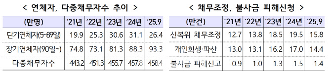 취약차주 지표도 경고음을 내고 있다. 지난해 12월 기준 단기 연체자는 26만3000명, 장기 연체자는 93만6000명으로 집계됐다. 다중채무자는 90만명을 넘어섰고, 신용회복위원회의 채무조정 신청도 20만9000건에 달했다. 단기 충격은 진정됐지만, 회복에 실패한 차주가 누적되고 있다는 판단이다.