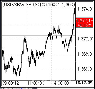 이날 환율은 역외 환율을 반영해 전 거래일 종가보다 3.6원 오른 1368.0원에 개장했다. 개장 이후 환율은 1365.0원으로 상승 폭을 좁히더니, 오후에는 반등했다. 오후 2시께는 1371.9원까지 올랐다. 이후에도 환율은 1370원을 중심으로 등락하다 장을 마쳤다.