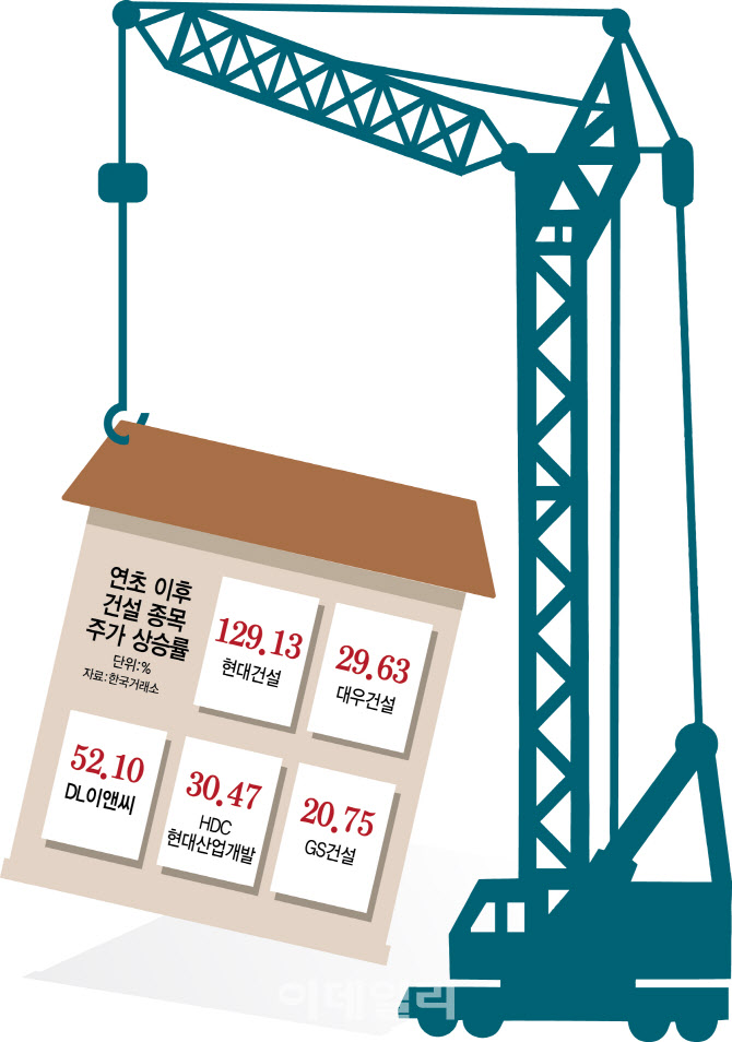 26일 한국거래소에 따르면 올 들어 KRX 건설업종 지수 수익률은 36.33%로, 코스피(8.44%)를 27.89%포인트 앞질렀다. 특히 현대건설(000720)(129.13%), DL이앤씨(375500)(52.10%), HDC현대산업개발(294870)(30.47%), 대우건설(047040)(29.63%), GS건설(006360)(20.75%) 등 대형사의 주가가 두드러지게 상승했다.