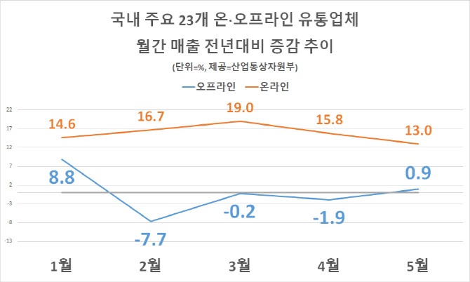 온라인 업체 매출 증가에 힘입어 산업부가 조사하는 23개 유통업체 전체 매출은 16조 1000억원으로 전년대비 7.0% 증가 흐름을 이어갔다.