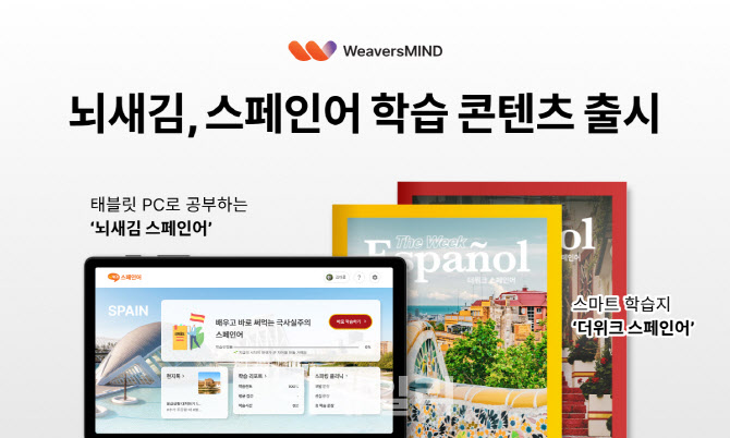 ‘뇌새김 스페인어’는 태블릿 기반 학습 프로그램으로, ‘더위크 스페인어’ 커리큘럼을 기반으로 영상 강의를 제공한다. 반복 말하기 훈련, 음성 인식 피드백을 통해 회화 실력을 강화할 수 있다.