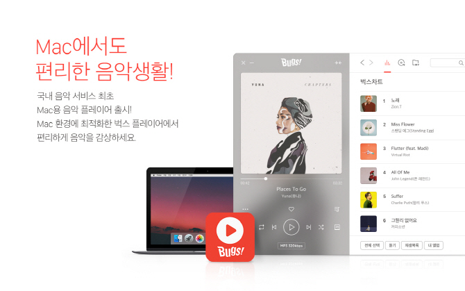 맥용 ‘벅스 플레이어’는 맥 운영체제(Mac OS)를 위해 국내 음악 서비스 업체가 최초로 직접 개발한 공식 음악 플레이어다. 애플 맥 앱스토어에서 앱을 다운로드 받아 사용할 수 있다.