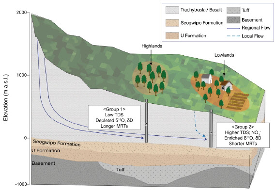 다중 환경추적자 자료를 상호 검증해 연령모델에 적용한 결과, 제주삼다수의 근원이 되는 빗물은 한라산 국립공원 내 해발 1450m 이상 고지대에서 함양되는 것으로 확인됐으며, 지하수의 평균 체류시간은 약 31년으로 산정됐다.