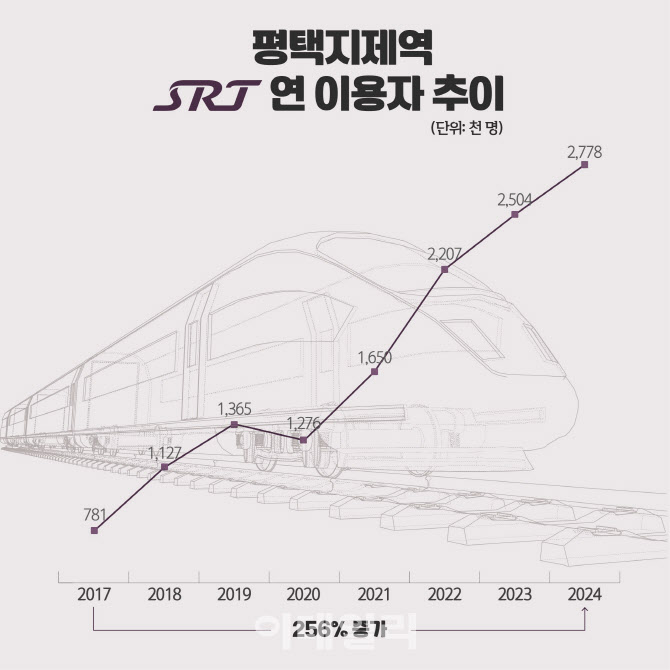 13일 경기 평택시에 따르면 평택지제역의 연간 SRT 승하차 인원은 2017년 78만1000명에서 지난해 277만8000명으로 7년 만에 256% 증가한 것으로 나타났다. 전체 32개 역사 중 증가율 1위에 달하는 수치다.