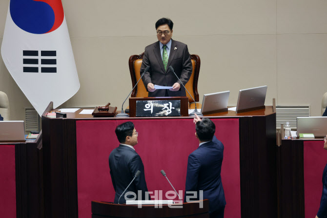 [이데일리 노진환 기자] 24일 국회 본회의에서 한덕수 대통령 권한대행 국무총리의 추가경정예산안 시정연설 후 우원식 국회의장이 발언하자 국민의힘 권성동 원내대표가 항의하고 있다.
