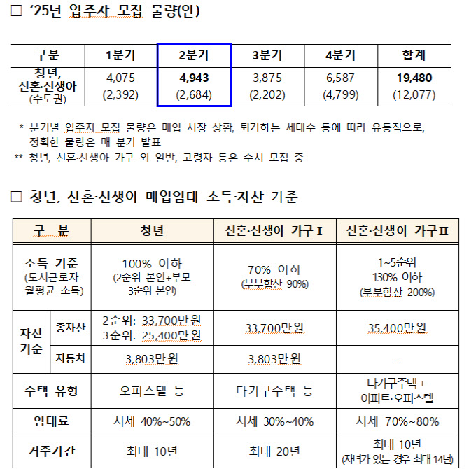 이번 2차 모집 규모는 청년 2508가구, 신혼·신생아 2435가구 등 총 4943가구다. 3월 1차 모집 때는 4075가구였으나 868가구 가량 늘어난 것이다. 신청자 자격 검증 등을 거쳐 이르면 9월말부터 입주할 수 있다.