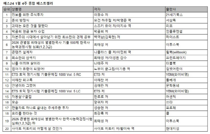 예스24 1월 4주 종합 베스트셀러 순위에서 광수네복덕방 대표이자 경제 분야 전문가인 이광수 교수의 ‘진보를 위한 주식투자’가 4주 연속 1위에 오르며 독보적인 인기를 이어갔다. 모건 하우절의 신작 ‘돈의 방정식’은 지난주보다 한 계단 상승한 2위를 차지했으며, 2025년 아쿠타가와상 수상작 ‘괴테는 모든 것을 말했다’가 3위에 올랐다. 109만 투자 멘토 ‘박곰희TV’의 ‘박곰희 연금 부자 수업’은 4위로 진입했고, 경제 전문 크리에이터이자 투자 교육 강사 백억남의 ‘자본주의 시대에서 살아남기 위한 최소한의 경제 공부’는 5위를 기록했다.