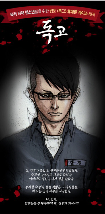 ‘독고’는 학교폭력으로 사망한 쌍둥이 형(강후)을 대신해 동생(강혁)이 ‘일진’들을 하나씩 쓰러뜨려 나가는 복수극으로 학교 폭력과 집단 따돌림 현상을 웹툰으로 낱낱이 공개하고 있다.