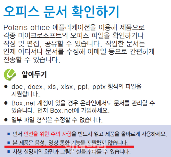 삼성전자 관계자는 “이 제품에는 전화 기능을 추후에 카카오톡 등 앱을 깔아 인터넷 전화 형태로 이용할 수는 있지만 물리적으로 추가할 수는 없다”며 “한글파일은 별도로 프로그램을 깔거나 업데이트를 받으면 가능하지만 제품 자체는 MS오피스 문서만 지원한다”고 설명했다.
