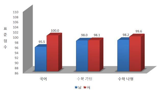 여학생의 표준점수 평균은 △국어 100점 △수학가형 98.1점 △수학나형 99.6점이다. 이는 남학생보다 각각 4.5점(국어)·0.1점(수학가형)·1.4점(수학나형) 높은 수치다. 남학생은 △국어 95.5점 △수학가형 98점 △수학나형 98.2점이다.
