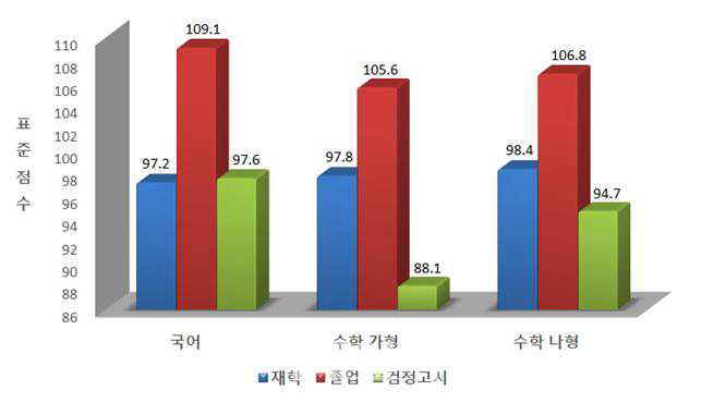 이번에도 재수생은 국어, 수학가형, 수학나형에서 모두 표준점수 평균이 졸업생을 압도했다. 재수생은 △국어 109.1점 △수학가형 106.6점 △수학나형 106.8점으로 재학생의 97.2점(국어), 97.8점(수학가형), 98.4점(수학나형)보다 각각 11.9점(국어), 8.8점(수학가형), 8.4점(수학나형) 높았다.