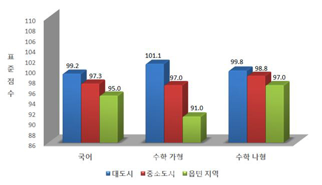 지역별로는 중소도시나 읍면지역보다 대도시에서 공부하는 학생들의 표준점수 평균이 국어(99.2점)·수학가형(101.1점)·수학나형(99.8점)에서 모두 높게 나타났다. 표준점수가 가장 낮은 읍면지역은 국어 95점, 수학가형 91점, 수학나형 97점이다. 대도시와는 각각 4.2점(국어)·10.1점(수학가형)·2.8점(수학나형) 차이를 보였다.