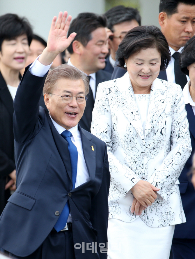 [포토]시민들에게 인사하는 문재인 대통령과 영부인 김정숙 여사