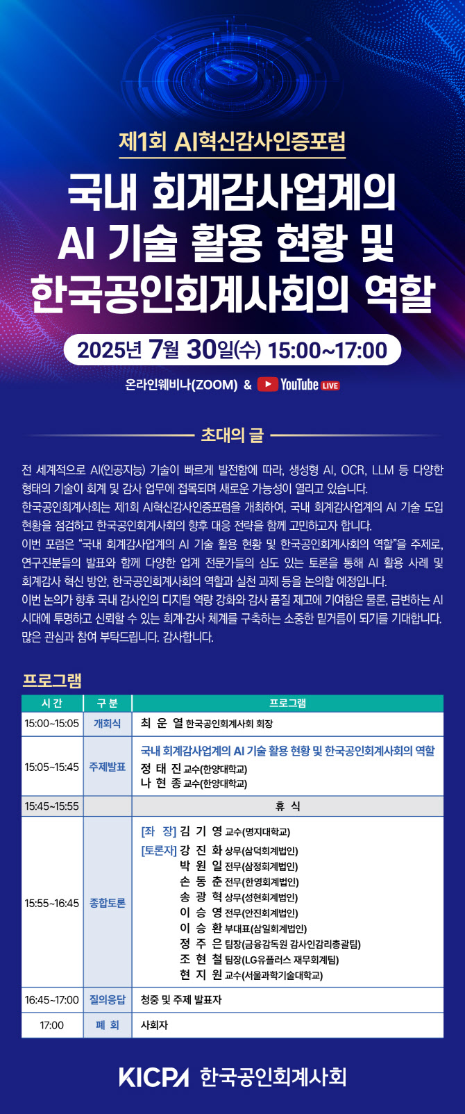 이어 종합토론에서는 김기영 명지대 교수가 좌장을 맡고 회계법인 디지털 담당 파트너들과 기업 및 학계, 감독기관 등 각계의 전문가들이 패널로 참여한다.