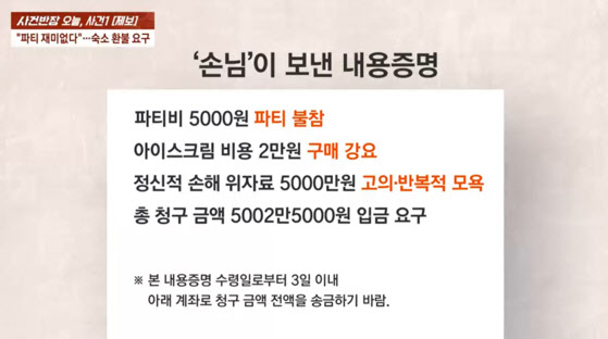 또한 B씨는 파티 당시 아이스크림을 스태프 추천으로 주문했는데, 이를 강제 구매라고 주장하며 비용과 함께 정신적 위자료 5000만원을 3일 내 송금하라는 내용증명을 보내기도 했다. A씨가 이를 무시하자 B씨는 다시 전화를 걸어 “왜 일을 크게 만드냐”, “나한테 이러면 본인만 힘들어진다”고 압박했다.
