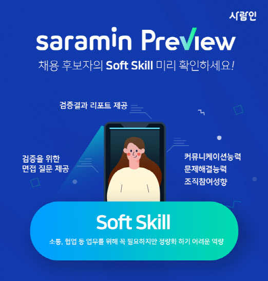 사람인 프리뷰는 수치나 시험으로 정량화하기 어려운 소프트 스킬을 미리 검증할 수 있도록 개발한 선발 도구다. 인사담당자가 후보자에게 검사를 제안하면 후보자는 인공지능(AI) 기반 동영상 면접 앱 ‘아이엠그라운드’를 활용해 검사를 진행한 후 평가와 분석 등 리포트를 받는다.