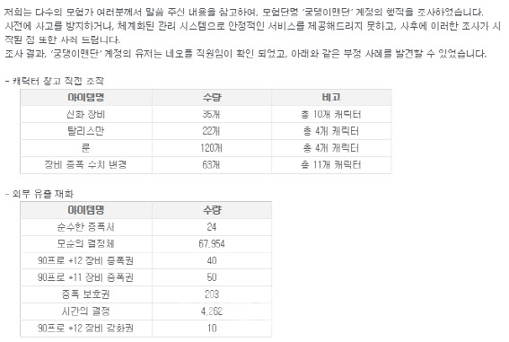 해당 직원은 ‘궁댕이맨단’이라는 계정으로 개발자 권한을 활용해 캐릭터의 창고를 직접 조작하거나 외부에 재화를 유출했다. 직원이 생성해 외부에 유출한 아이템 중에는 ‘90% +12 장비 증폭권’ 40장, ‘90% +11 장비 증폭권’ 50장 등 게임에서 매우 희귀하고 중요한 아이템도 다수 포함됐다. 이용자들은 해당 아이템의 가치가 5000만원 상당에 달하는 것으로 보고 있다.