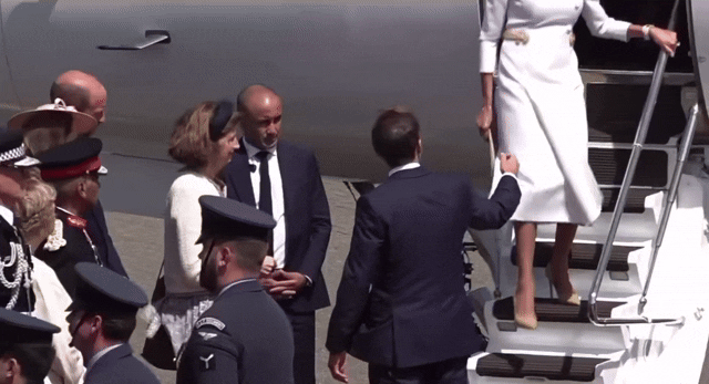 런던에 위치한 노솔트 왕립 공군 기지에 도착한 마크롱 부부는 전용기에서 내렸고, 공항에는 윌리엄 왕세자와 케이트 미들턴 왕세자빈이 기다리고 있었다. 먼저 지상으로 내려온 마크롱 대통령은 브리지트 여사를 에스코트하기 위해 손을 내밀었지만, 브리지트 여사는 마크롱 대통령의 손을 쳐다보지 않고 혼자서 난간을 잡고 비행기에서 내렸다.