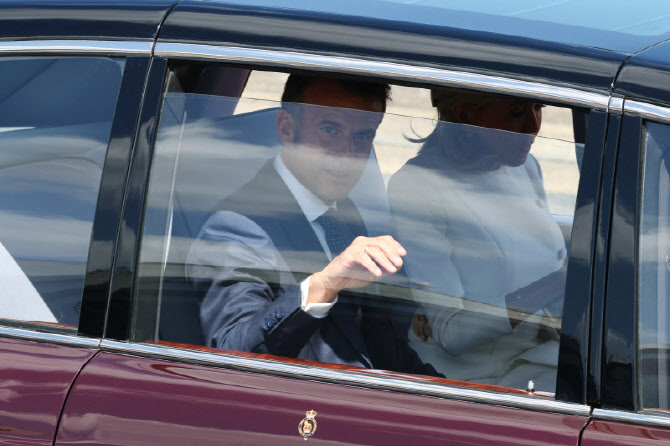 | | 8일 영국에 도착해 의전 차량을 타고 이동하는 마크롱 대통령 부부. (사진=REUTERS/Gonzalo Fuentes/Pool) |