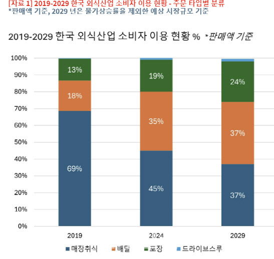 반면 매장 취식은 2023년 이후 지속적으로 그 비중이 줄어들고 있다. 이에 따라 2029년에는 배달과 매장 취식 비중이 거의 같아질 것으로 보인다.