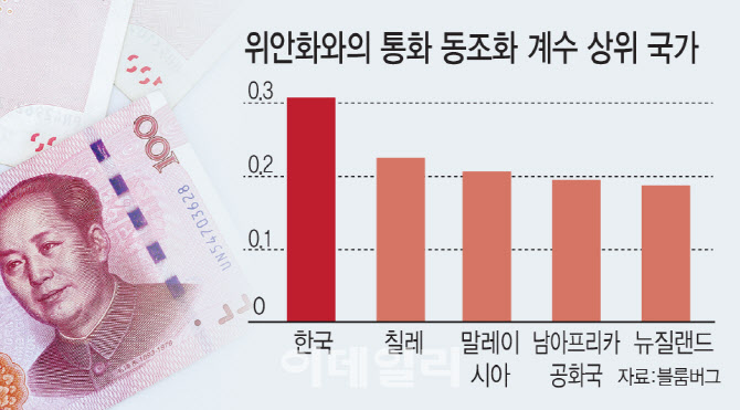 이는 원화 환율변동이 주요 국제통화에 연동한다고 할 때, 통화바스켓 중 위안화 비중이 31%를 차지한다는 의미다. 위안화의 영향력이 그만큼 크다는 뜻이다.