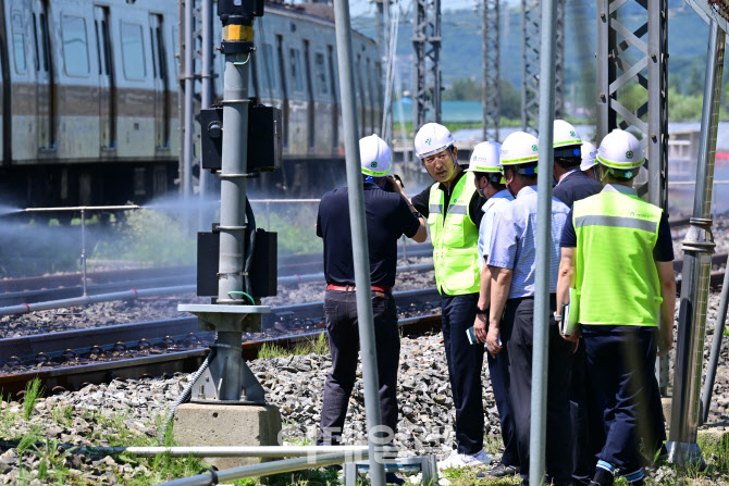 [이데일리 이영훈 기자] 오세훈 서울시장이 11일 서울 9호선 개화차량기지에서 레일 온도상승 방지를 위한 살수 설비 등을 점검하고 있다.