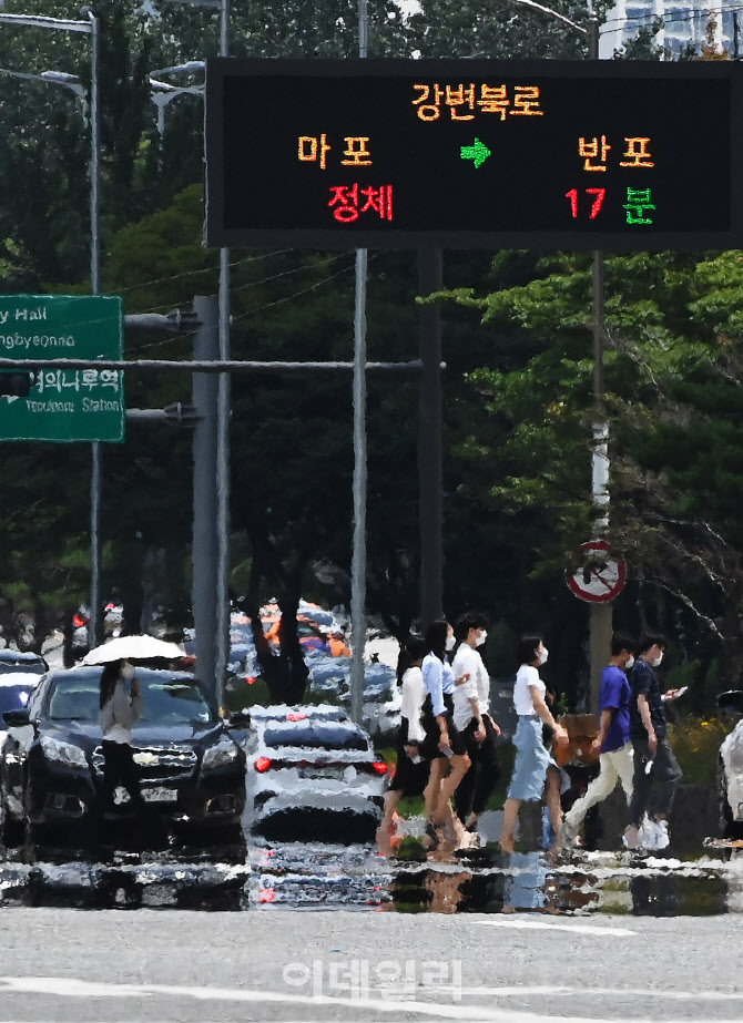 [이데일리 방인권 기자] 폭염 위기경보 수준이 '경계' 단계로 격상되며 본격적인 폭염이 찾아온 20일 햇빛이 강하게 쬐어 지면이 뜨겁게 달구어진 서울 영등포구 여의대로에 아지랑이가 피어오르고 있다.
