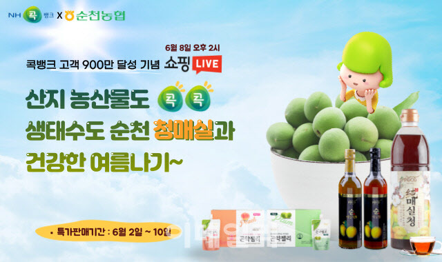 [이데일리 김태형 기자] 농협(회장 이성희)상호금융은 'NH콕뱅크' 고객 900만명 달성을 기념하여 제1회 전국팔도라이브경진대회에서 대상을 수상한 순천농협과 함께 오는 6월8일 오후 2시 생태수도 순천 특산물인 청매실·매실가공품을 라이브커머스로 할인 판매한다.