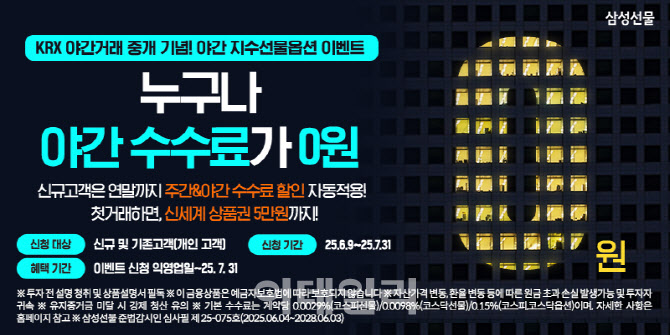 삼성선물 관계자는 “한국거래소가 파생상품 야간거래를 개시하면서 이전 유렉스(Eurex) 연계 거래와 비교해 거래 가능 상품 종류와 시간이 확장됐다”며 “이번 이벤트를 통해 많은 고객들이 야간거래를 직접 경험해 보고 새로운 투자기회를 모색하길 바란다”고 전했다.