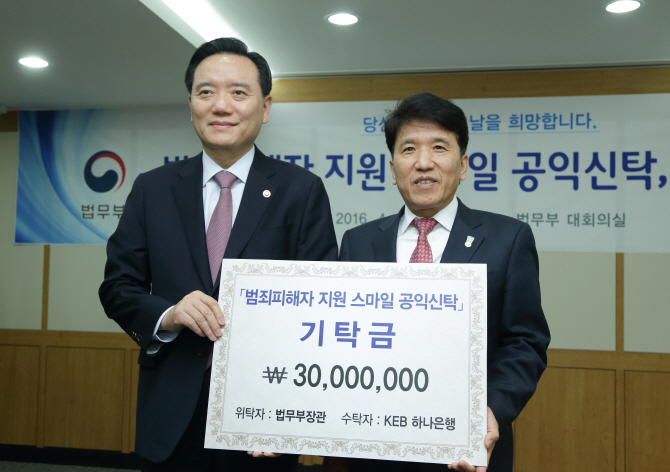 법무부는 20일 김현웅 법무부장관과 전국범죄피해자지원연합회 김갑식 회장, KEB하나은행 함영주 은행장 등 50여명이 참석한 가운데‘범죄피해자 지원 스마일 공익신탁’ 출범식을 열었다.