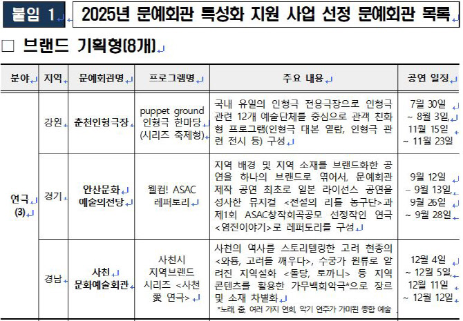 ‘브랜드 기획형’ 공모에서는 문예회관(프로그램) 18곳이 지원한 가운데 △춘천인형극장(강원)과 △안산문화예술의전당(경기) △김해문화의전당(경남) △함안문화예술회관(경남) △사천문화예술회관(경남) △세종예술의전당(세종) △한국소리문화의전당(전북) △제주아트센터(제주) 등 총 8곳을 선정했다. 지난 5월 함안문화예술회관을 시작으로 각 문예회관은 올 12월까지 공연을 연다.
