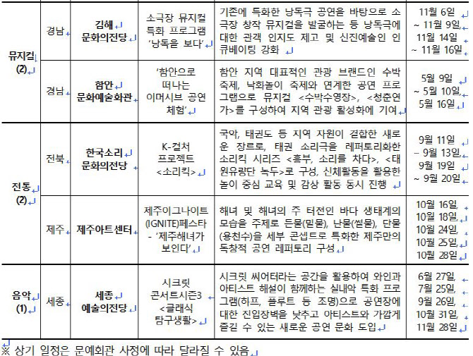 신은향 문체부 예술정책관은 “지역 문화예술 유통의 중심인 문예회관의 기획·제작 역량을 강화하고, 지역민의 문화 향유를 확대하는 것이 중요하다”며 “이번 사업을 통해 지역마다 특화된 대표 프로그램을 발굴해 창·제작, 유통, 소비의 선순환 구조를 마련하고, 지역 문화예술의 자생력을 강화할 수 있도록 지원하겠다”고 말했다.