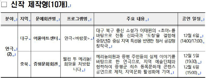 ‘신작 제작형’ 공모에서는 총 61곳 문예회관이 지원했다. 3월 1차 심의를 통해 17곳을 선정, 시연회(쇼케이스) 제작비를 지원했다. 이어 7월 7~9일 2차 시연회 심의를 통해 △구리아트홀(경기) △다산아트홀(경기) △의정부예술의전당(경기) △어울아트센터(대구) △대전예술의전당(대전) △해운대문화회관(부산) △꽃바위문화관(울산) △보성군문화예술회관(전남) △제주문예회관(제주) △증평문화회관(충북) 등 총 10곳을 선정했다. 각 문예회관은 공연을 제작해 올해 하반기 정식 무대에 올린다.
