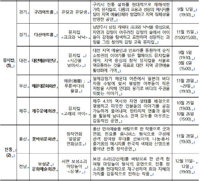 ‘신작 제작형’에 선정된 의정부예술의전당은 ‘동요 음악극’에 특화한 프로그램 ‘반달의 꿈’을 제작, 동요의 가치와 시대 정서를 전달한다. 제주문예회관은 뮤지컬 ‘고래의 아이’를 제작, 제주 4·3의 역사적 아픔과 자연유산을 판타지 가족극으로 구현한다.