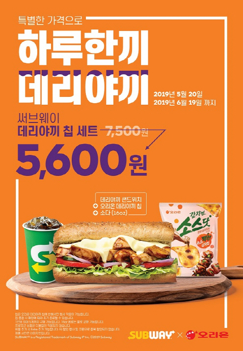 글로벌 샌드위치 브랜드 써브웨이는 15cm 치킨 데리야끼 샌드위치와 오리온 데리야끼 칩, 음료로 구성된 ‘데리야끼 칩’ 세트를 5600원에 판매하는 특별 프로모션을 진행한다고 20일 밝혔다.