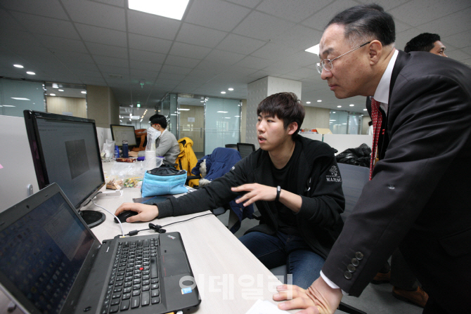 홍남기 미래창조과학부 제 1 차관이 19일 오후 서울 종로구 서울창조경제혁신센터를 방문해 전희재 세븐픽쳐스 대표로부터 문화예술전문 팝업스토어 플랫폼에 대한 설명을 경청 하고 있다. 미래창조과학부 제공.