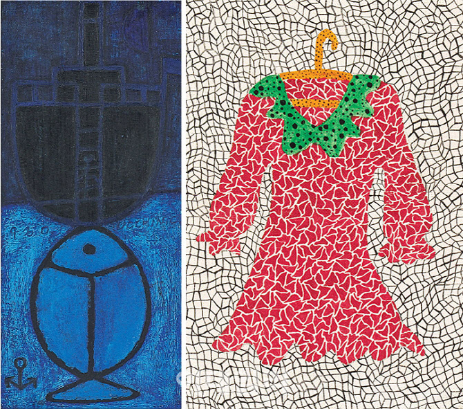| | 서울옥션과 케이옥션이 2026년 첫 메이저 경매에 출품하는 작품들. 장욱진의 ‘배와 고기’(1960, 22.1×10㎝·왼쪽)는 서울옥션 ‘제189회 미술품 경매’에 추정가 1억∼2억원을 달고 나선다. 쿠사마 야요이의 ‘드레스’(Dress 1982, 22.5×154.5㎝)는 케이옥션 ‘1월 경매’에 추정가 5억∼8억원을 달고 새 주인을 찾는다. 양 경매사의 새해 첫 경매는 초고가 출품작 없이 미술시장을 움직이는 블루칩 작가의 수작들로 꾸렸다는 점이 도드라진다(사진=서울옥션·케이옥션). |
