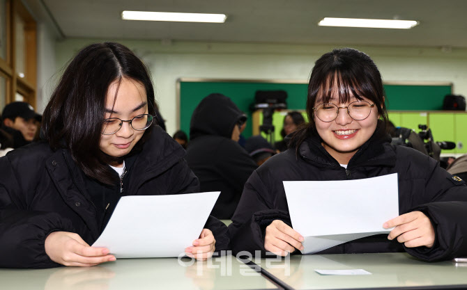 [이데일리 김태형 기자] 5일 서울 광진구 광남고등학교에서 학생들이 '2026학년도 대학수학능력시험 성적통지표'를 확인하고 있다.