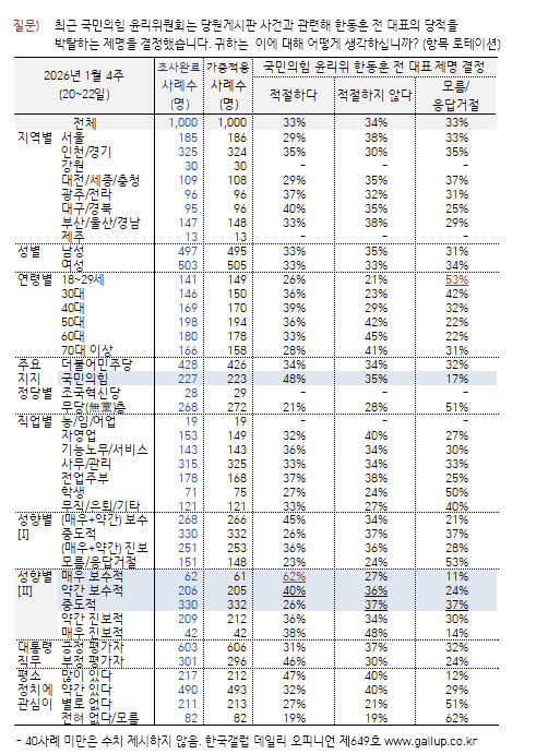 지난 1월 14일 국민의힘 윤리위원회가 한동훈 전 대표에 대해 제명을 결정한 데 대해 유권자 1000명에게 물은 결과, 적절하다는 응답과 부적절하다는 응답이 오차범위 내 접전을 이뤘다.