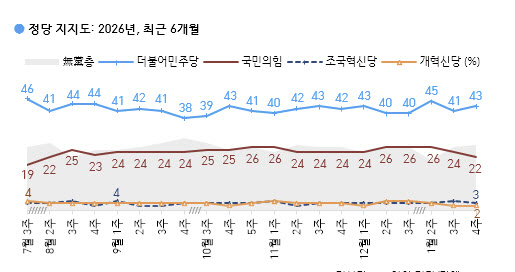 조국혁신당은 3%, 개혁신당 2%, 진보당은 1%를 기록했으며 지지하는 정당이 없다고 밝힌 무당층은 27%다.