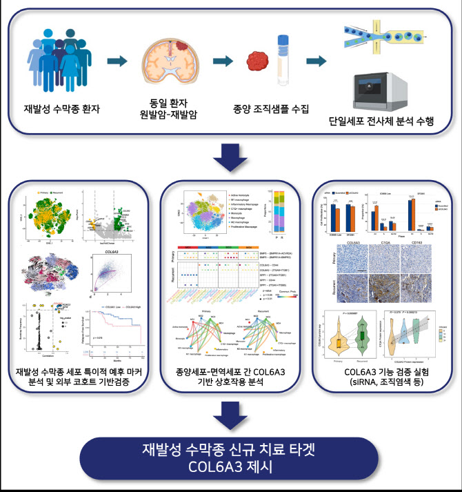연구팀은 재발하는 수막종을 단일세포 수준에서 유전체 분석해 종양의 변화 과정과 면역세포와의 상호작용을 체계적으로 밝혔다. 특히 COL6A3 유전자가 재발 위험을 높이는 핵심 요인이자 유망한 치료 표적임을 입증했다.