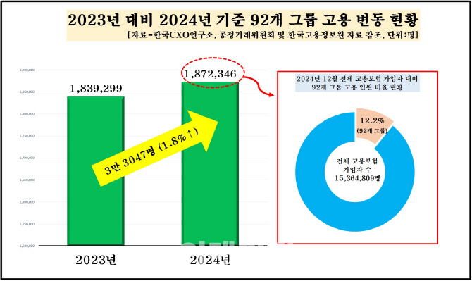 조사 대상 92개 그룹 중 최근 1년 새 직원 수가 증가한 곳은 46곳으로 나타났다. 직원 일자리가 늘어난 46곳 중에서 고용 인원이 가장 많이 증가한 그룹은 재작년에 이어 작년에도 ‘쿠팡’인 것으로 확인됐다. 쿠팡 그룹은 재작년 8만 4702명 수준에서 작년에는 9만 9881명으로 1년 새 직원 수가 1만 5179명 많아졌다.