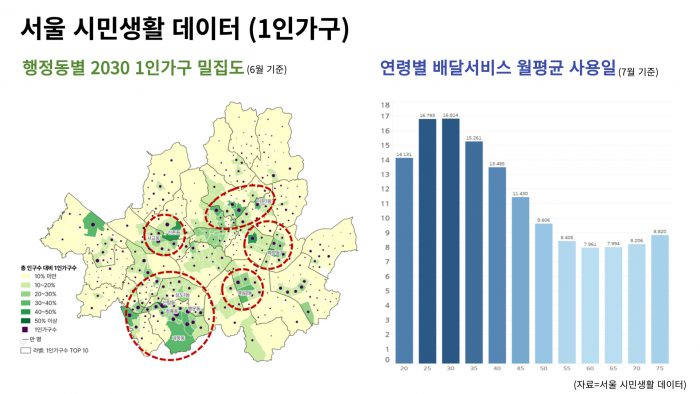 한편, 서울 시민생활 데이터는 공공데이터와 민간데이터가 결합돼 만들어졌다. 행정동별, 성별, 연령별로 세분화해 누구나 활용이 가능해 향후 1인가구 특성에 맞춘 정책 개발에 유용하게 쓰일 것으로 예상된다.
