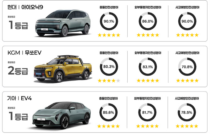 그 결과 현대 아이오닉9·팰리세이드·넥쏘와 기아 EV4는 모든 평가 분야에서 고른 점수를 받아 1등급을 획득했다.