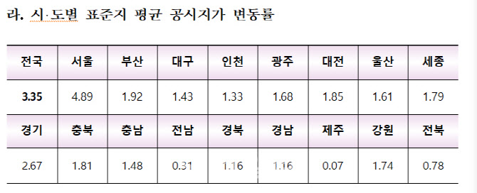 표준지 공시지가를 시도별로 살펴보면 서울이 4.89%로 가장 큰 폭으로 올랐고, 경기(2.67%), 대전(1.85%), 부산 (1.92%), 충북 (1.81%) 순으로 변동한 것으로 나타났다. 전국의 표준지 공시지가는 1㎡당 26만2975원, 서울은 729만6440원으로 집계됐다.