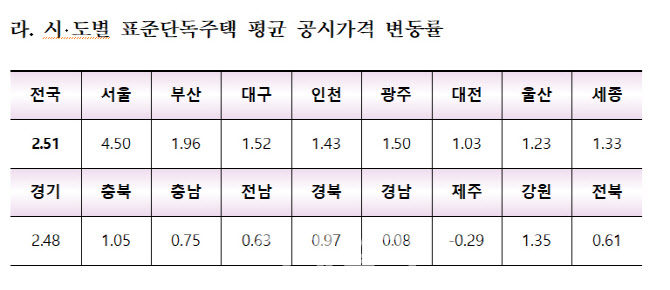 표준주택 공시가격도 서울이 4.50%로 가장 큰 폭으로 올랐으며 경기(2.48%), 부산(1.96%), 대구(1.52%,) 광주(1.50%) 순으로 변동했다. 전국 표준 단독주택 평균 가격은 1억7385만원이며 서울은 6억6388만 원으로 나타났다. 서울에서는 용산구(6.78%), 강남구(5.83%), 서초구(5.41%)의 표준주택 공시가격 상승률이 높았다.