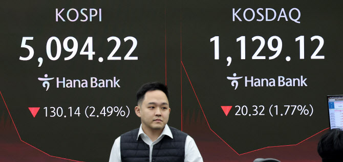 2일 엠피닥터에 따르면 이날 오전 11시3분 현재 코스피는 전거래일 대비 130.99포인트(2.51%) 내린 5093.37에 거래 중이다.