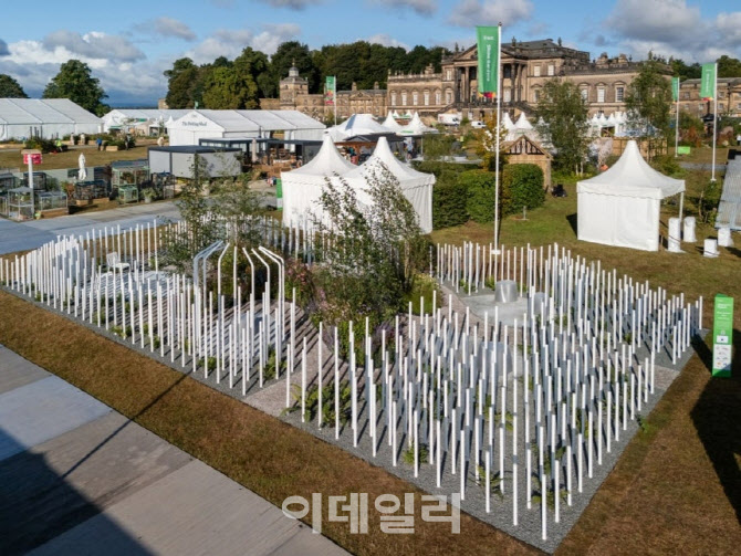 수상작 ‘정원이 속삭이다’는 다양한 높이로 배치된 하얀색 기둥을 통해 자연의 시적 풍경으로 초대하는 듯한 느낌을 주도록 연출했다. 자연과 건축, 예술이 조화를 이루도록 디자인했고 정원 내 포장과 의자 일부에는 플라스틱을 재활용한 3D프린팅 기술이 적용됐다고 현대건설은 설명했다.